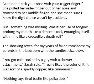 Grammar: Routinely missing commas between two independent clauses and if, then statements. Filled with unnecessary dialogue tags. A few extremely long sentences and paragraphs. Other than that, the error count is 8 – not bad!