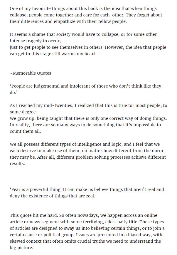 It’s been five years since the plague struck. Leah knows there are other survivors, but she’s avoiding them. She is doing just fine on her own. Surviving after everyone she knew died has made her physically strong and honed her intelligence, but she is emotionally devastated. There is nothing to fear if you don’t make yourself emotionally vulnerable.